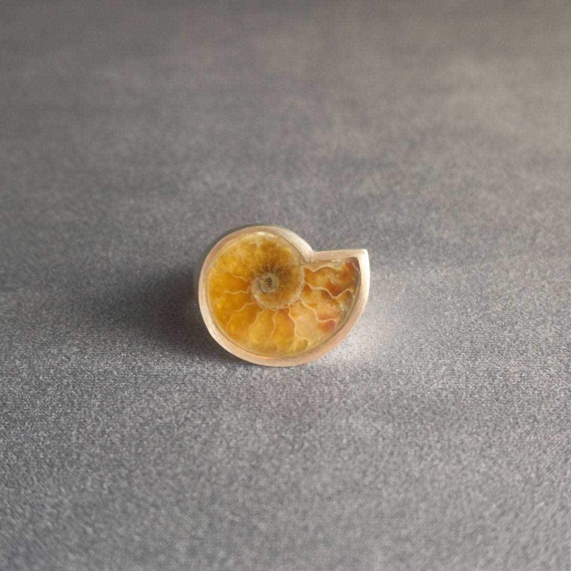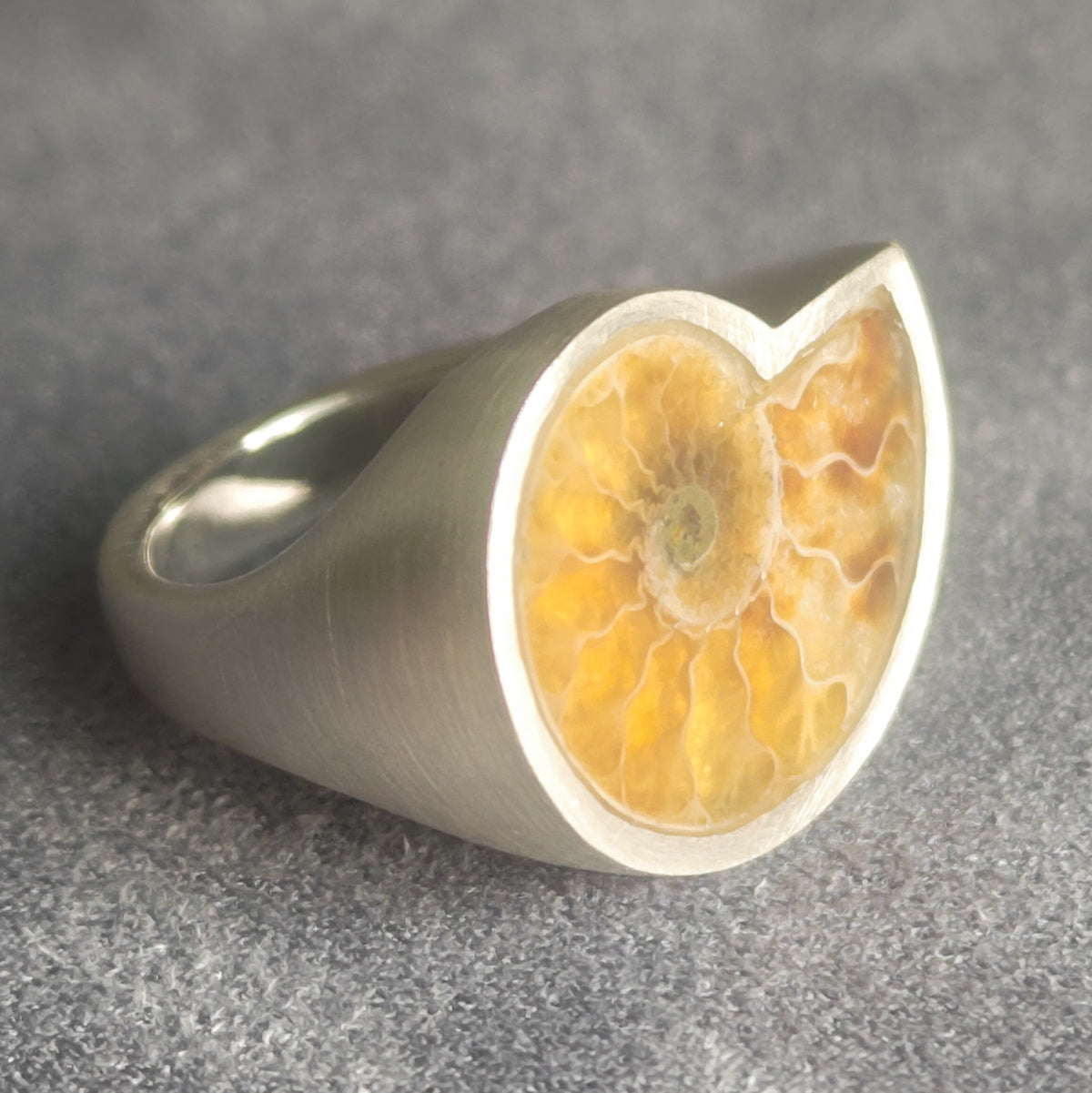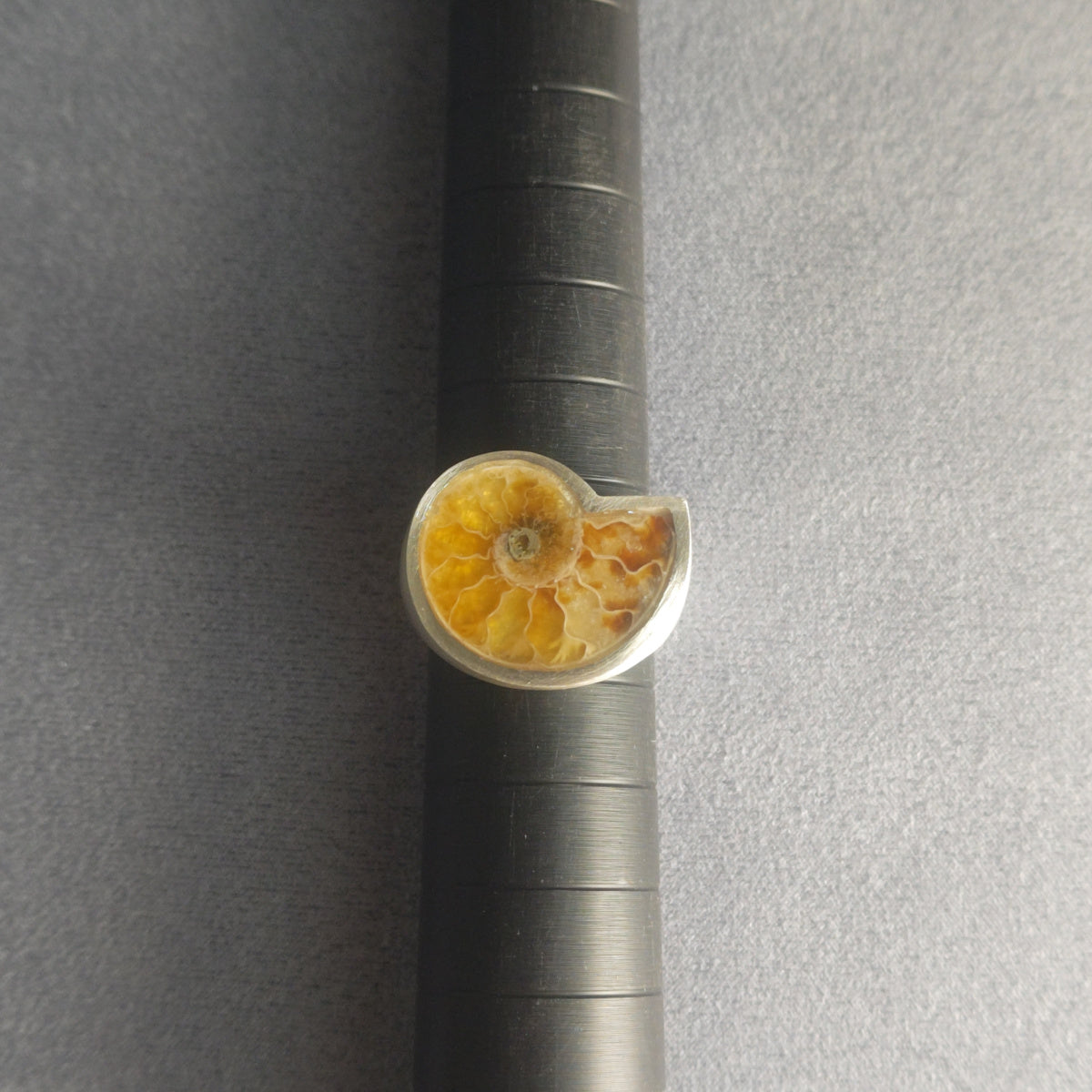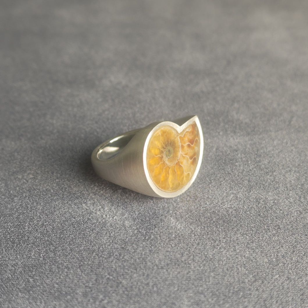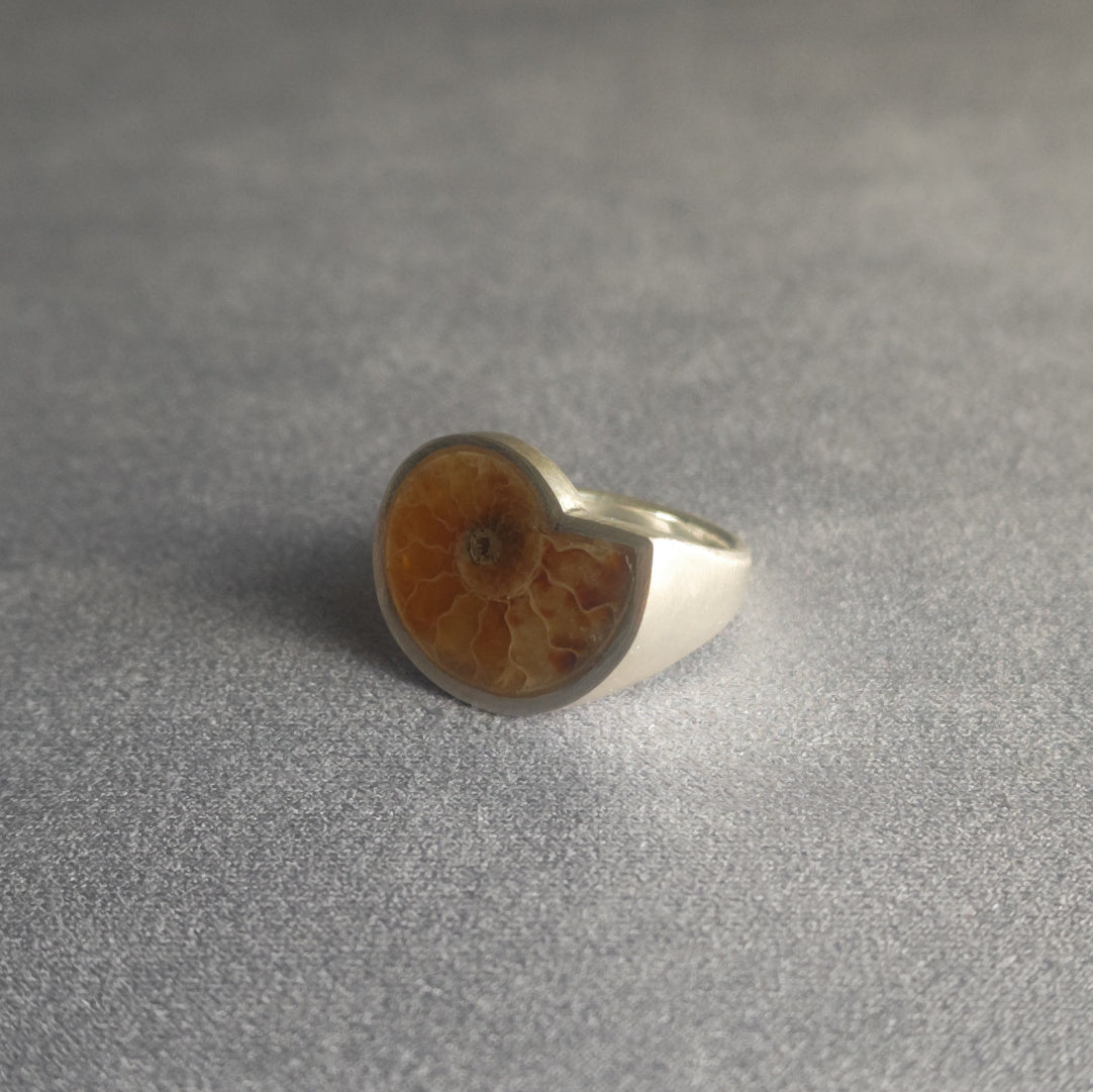 白亜紀(約1億年前)、マダガスカルで発掘されたアンモナイトの切片を用いた一点物のリング。