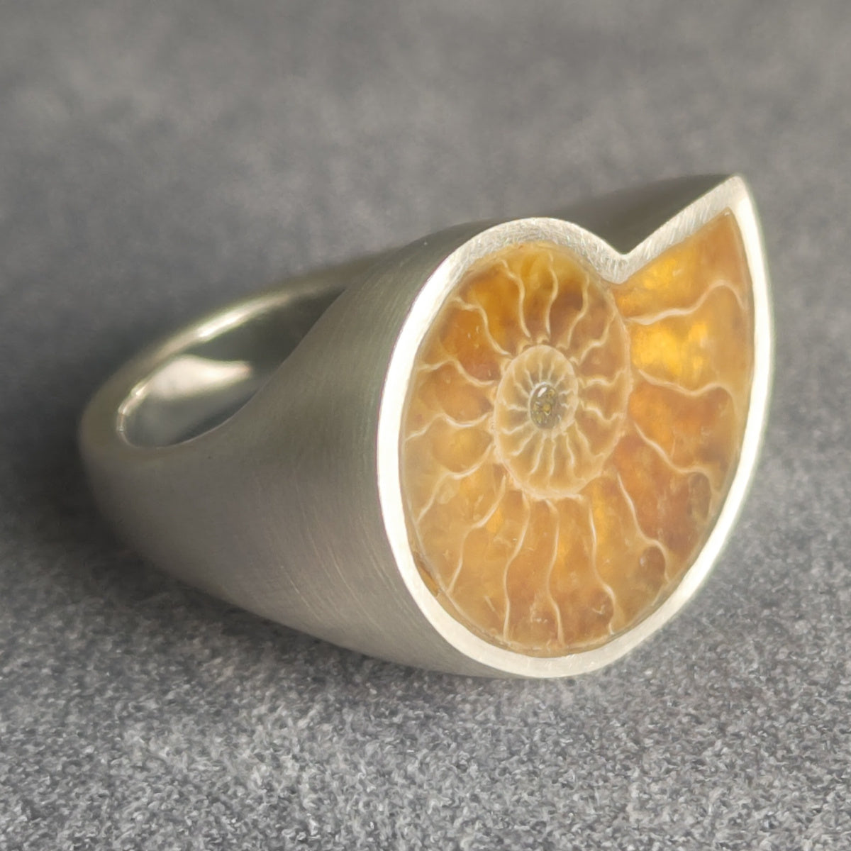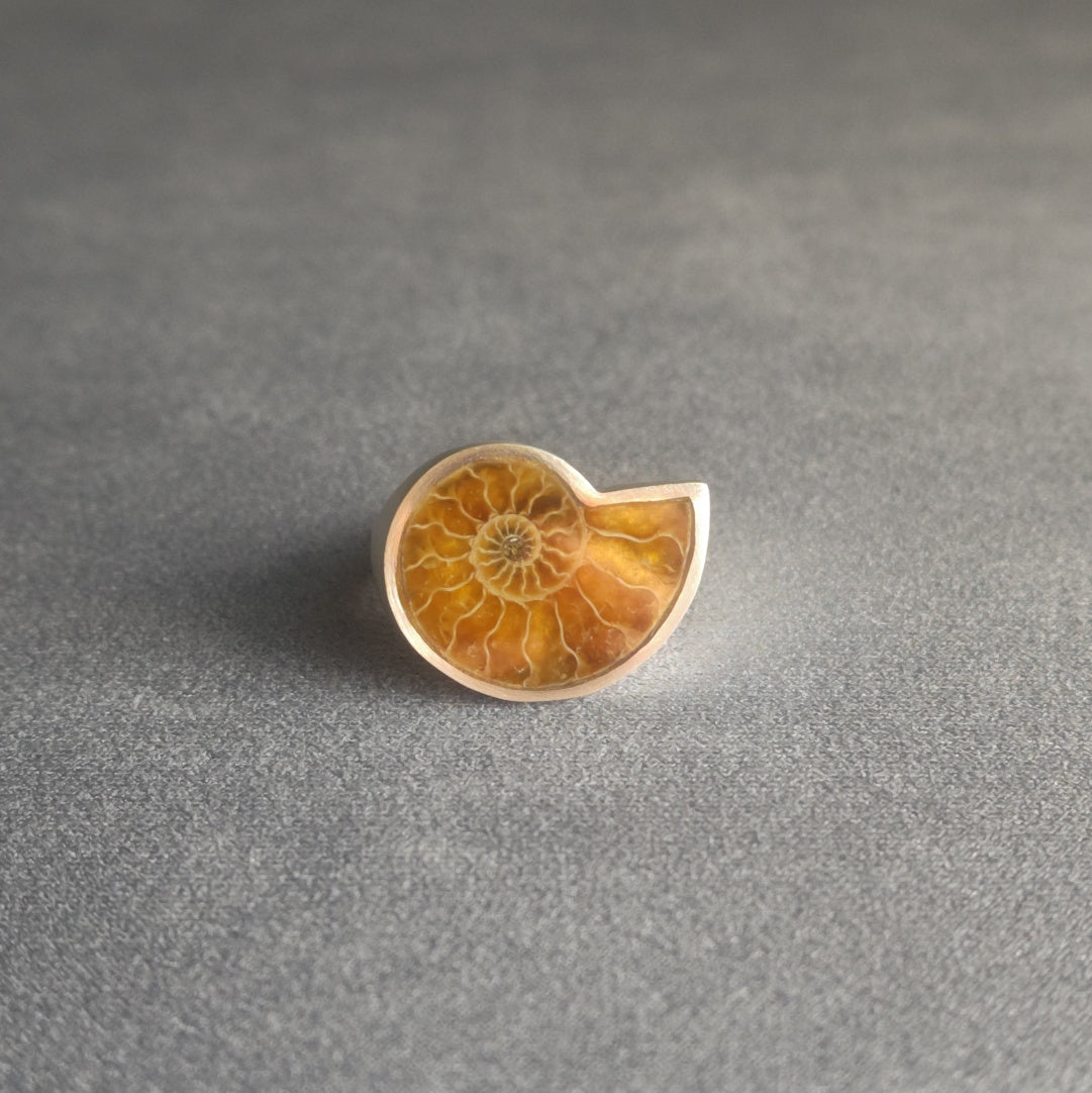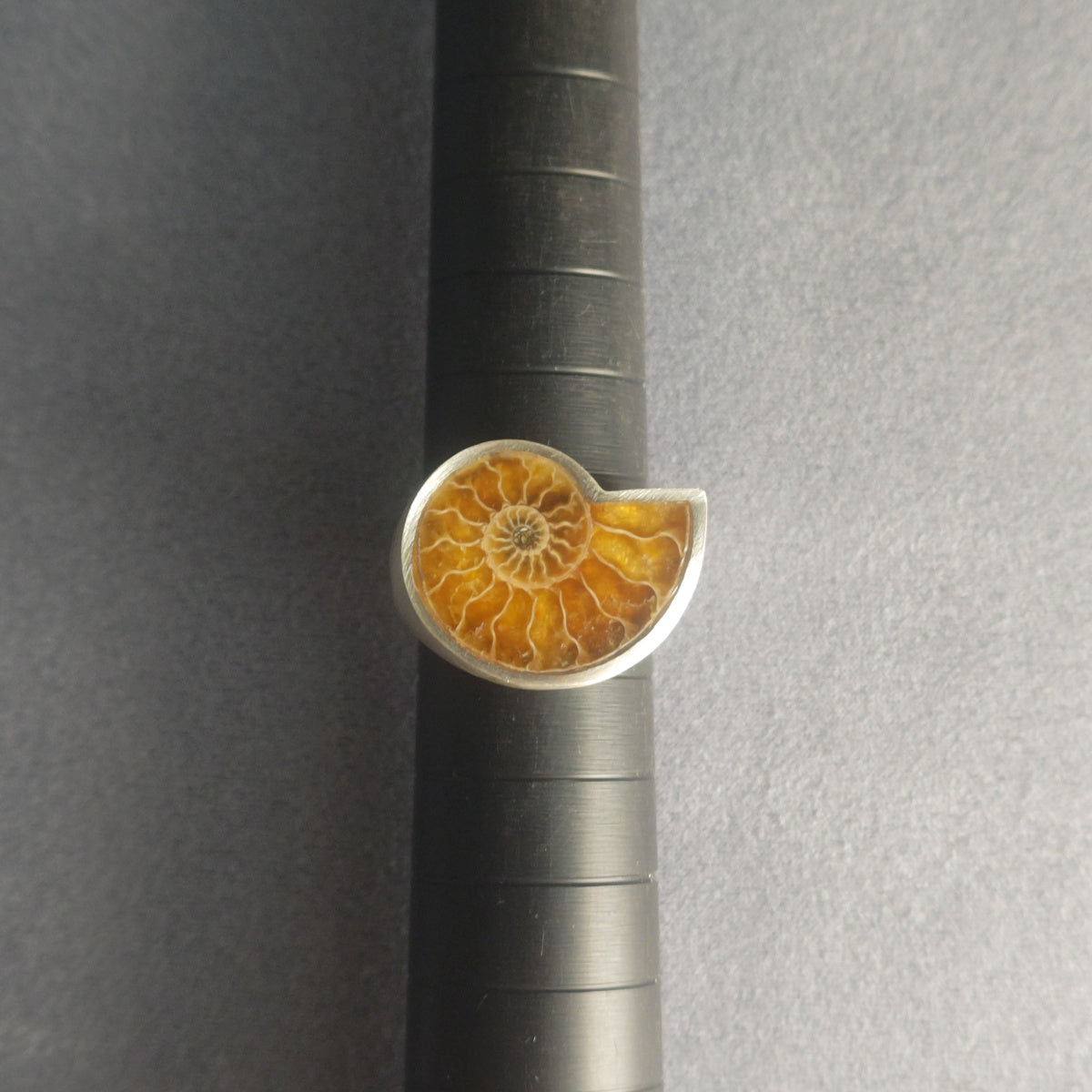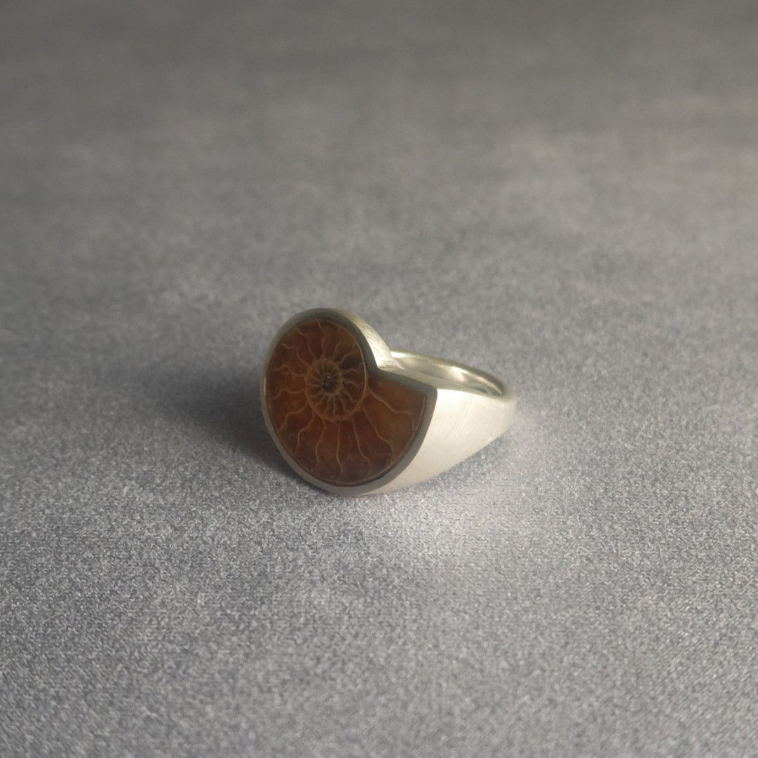 白亜紀(約1億年前)、マダガスカルで発掘されたアンモナイトの切片を用いた一点物のリング。