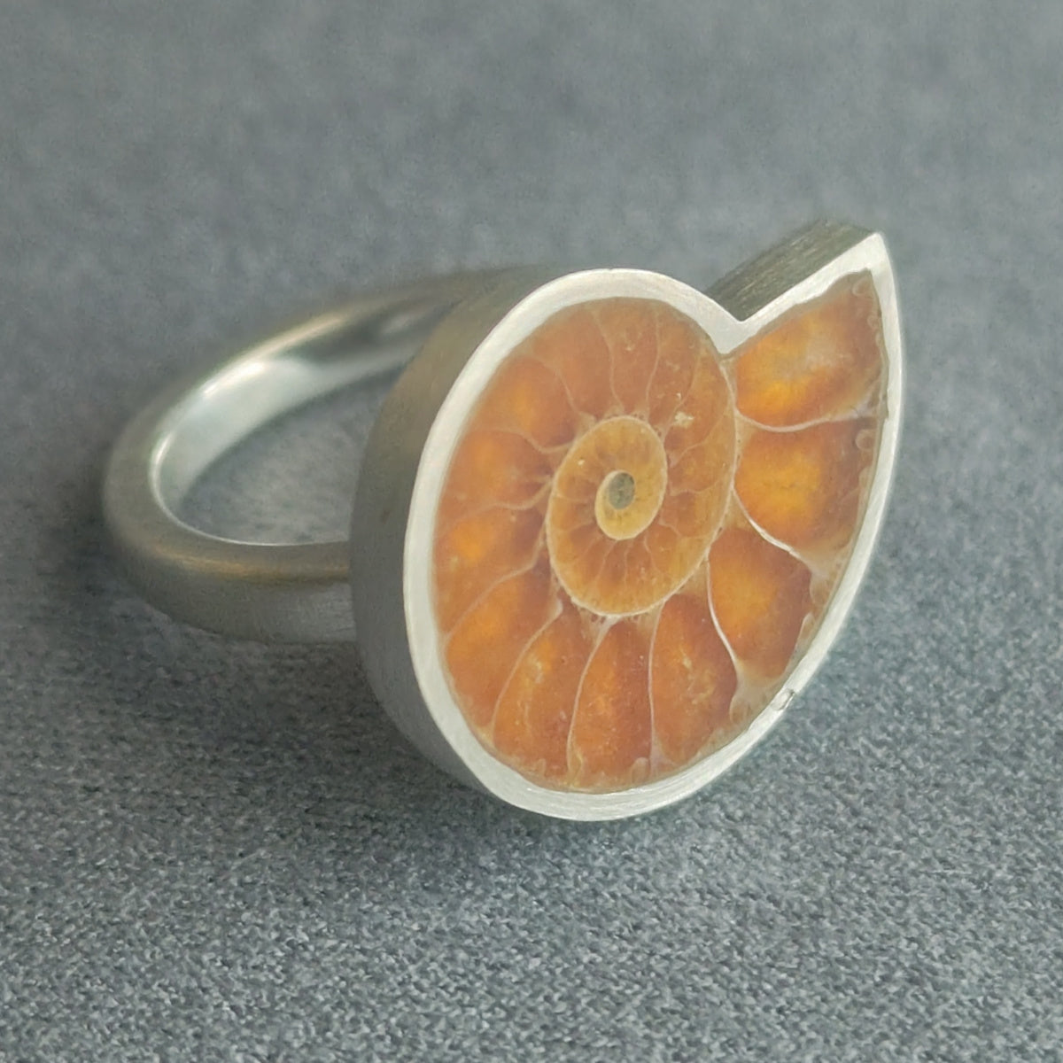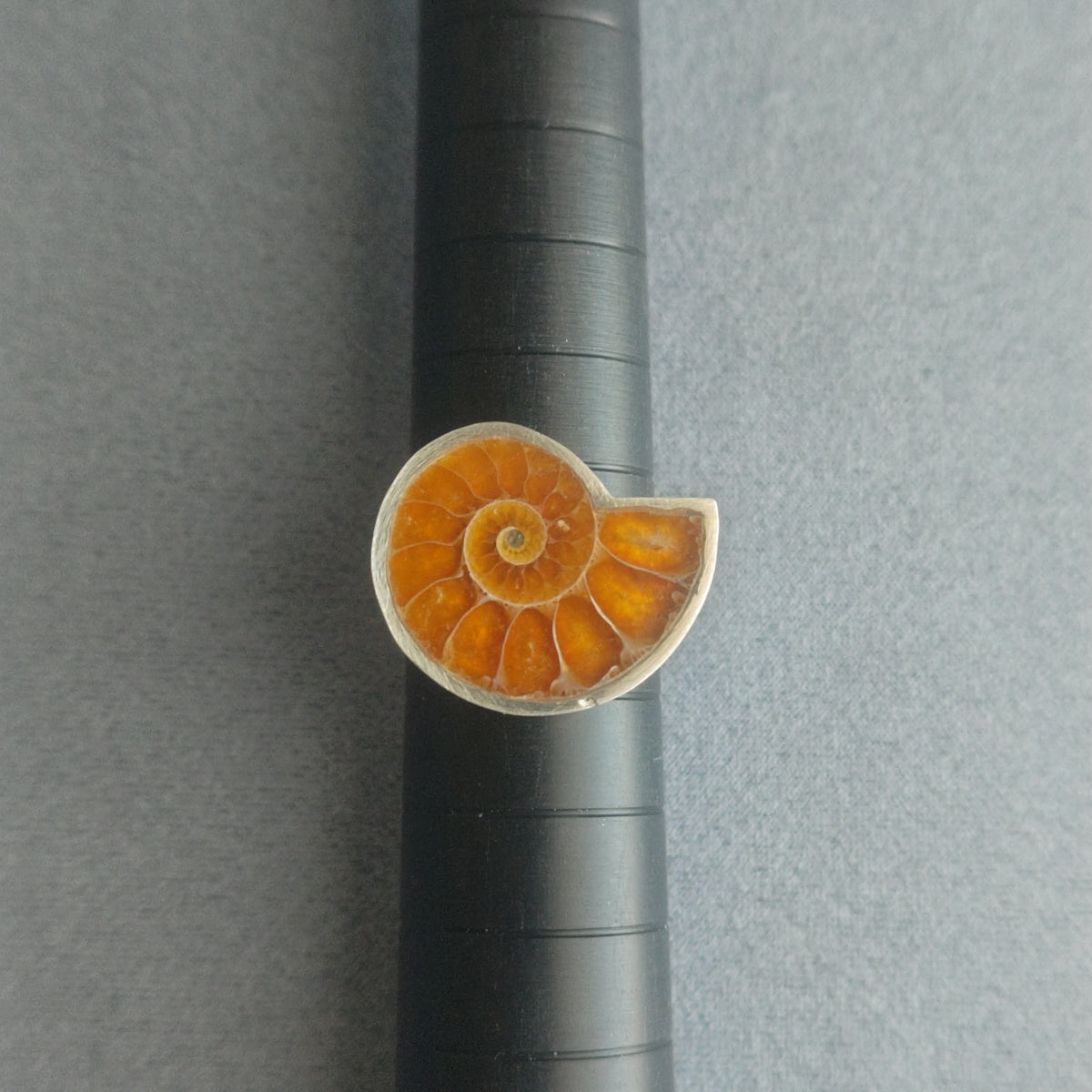 白亜紀(約1億年前)、マダガスカルで発掘されたアンモナイトの切片を用いた一点物のリング。