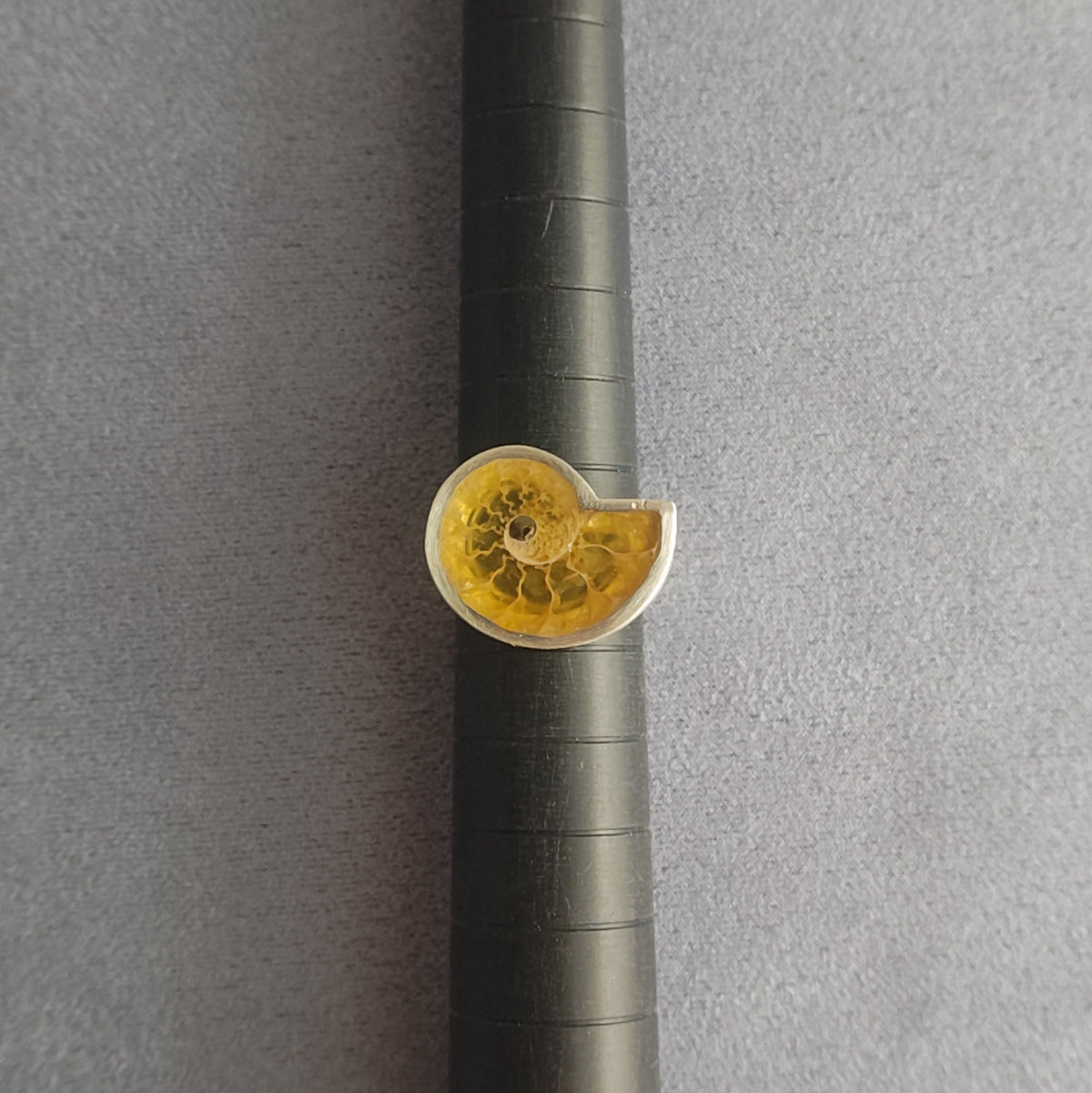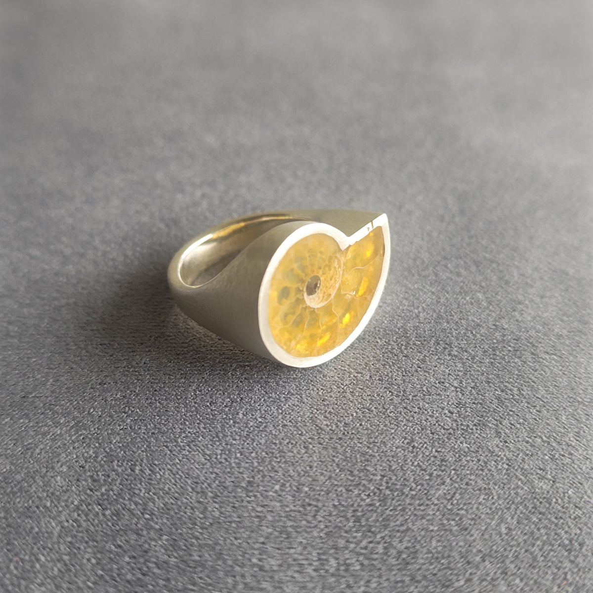 白亜紀(約1億年前)、マダガスカルで発掘されたアンモナイトの切片を用いた一点物のリング。